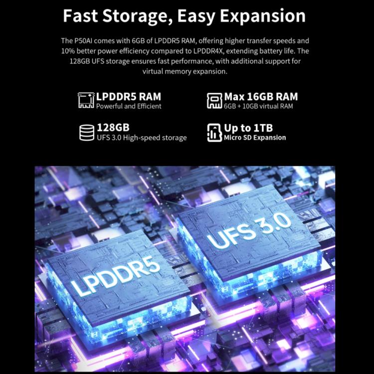 Powered by the advanced Allwinner A733 Octa-Core CPU (2.0GHz A76 + 1.8GHz A55) and paired with 6GB LPDDR5 RAM (plus up to 10GB virtual) and 128GB UFS 3.0 internal storage, the P50AI ensures lightning-fast app performance, seamless multitasking, and ample space for all your apps, files, and HD content.